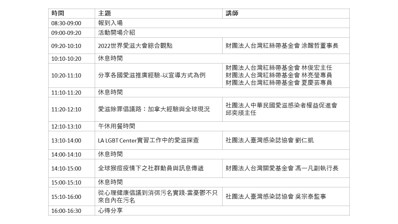 【關愛消息】活動訊息—2022 國際愛滋大會台灣民團分享會 視訊 關愛消息 | 2022 年 08 月 30 日 | 報名網址:https://neti.cc/MBprOan 報名時間:即日起至9/13 18:00 分享會時間地點: 2022/09/17(六)08:30-16:30 學客空間(臺北市中山區松江路158號5樓之4) 活動流程: 各主題內容概述: